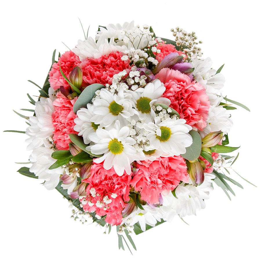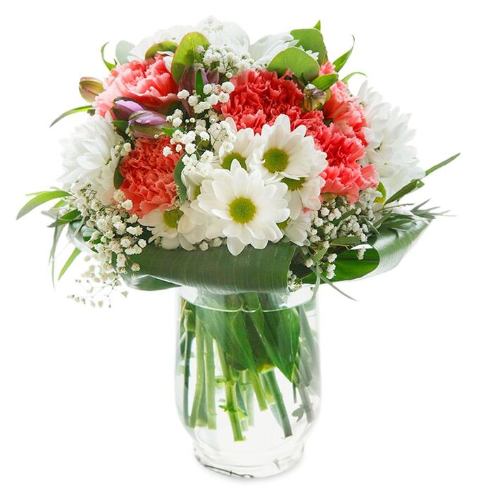 Surprise a loved one with our stunning and unique seasonal flower arrangement. This beautiful bouquet features snow-white chrysanthemums, airy gypsophila, and soft pink carnations, artfully combined with lush aspidistra leaves.